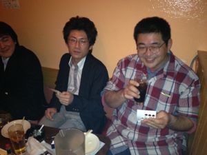 トライアングルサービス藤野社長、エーエムネット金光社長、大久保アルファステーション店長、Hさん、旧姓Kさんのテーブル。