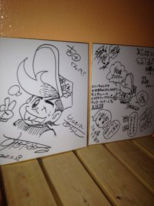 その2次会の席で更なるサプライズ!!プレゼントとして「ゲームセンターあらし」の著者すがやみつる先生や、江崎ころすけ様などよりお祝いの寄せ書きメッセージ色紙を頂きました。(各先生方とサプライズを仕込んでくれたみんなありがとう)