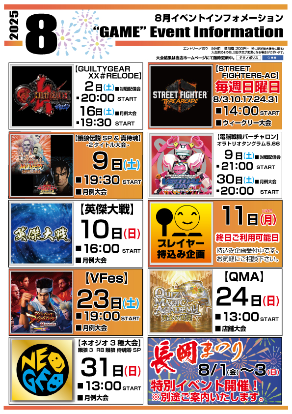 『餓狼伝説スペシャル&真侍魂 月例大会』 『電脳戦機バーチャロン OT5.66 配信対戦会』 |