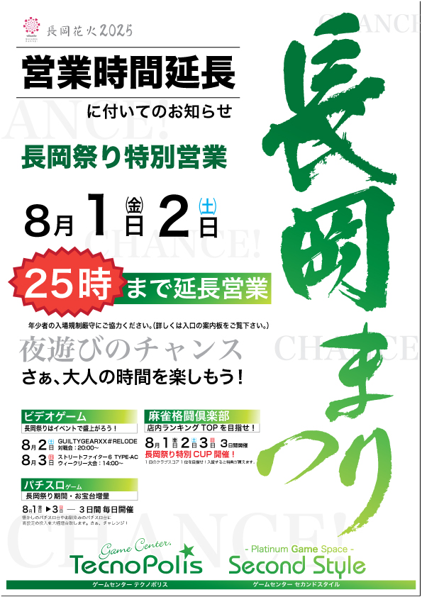 | 1日〜3日 | 金〜日 | 終日 | 『麻雀格闘倶楽部 長岡祭り特別CUP』 『パチスロコーナーお宝台増量』 |