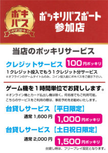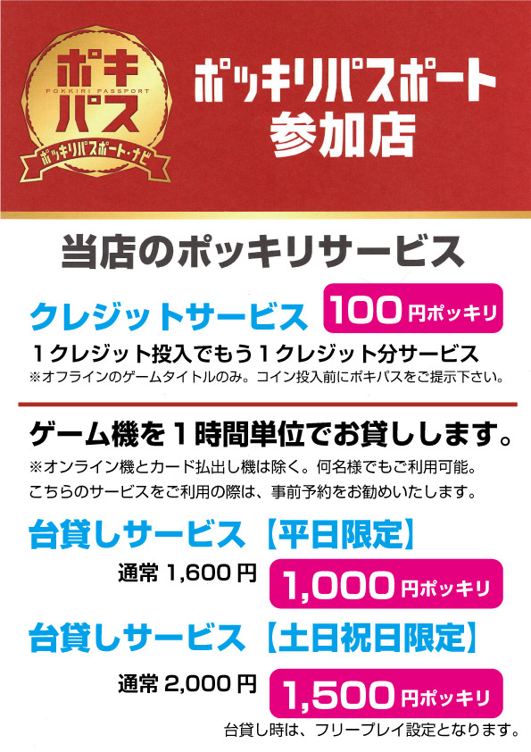 サービスをご利用の際は、お手数ですがコイン投入前にスタッフに「ポキパスを見た」と