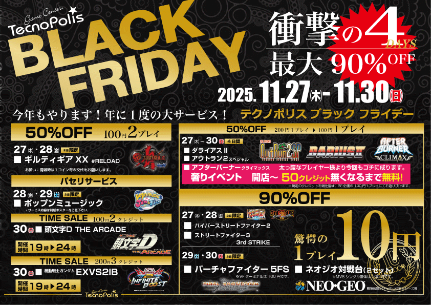 ブラックフライデー20250件 11月27日(木)〜11月30日(日)『テクノポリスブラックフライデー2025』衝撃の4日間、最大90%OFFや奢りイベントなど!サービス内容は、店内ポスターや筐体ポップをご覧ください。 ABOUT THE AUTHORranboテクノポリス主任してます。OTHERS OF THIS AUTHOR2025/12/28ゲーム大会結果ストリートファイター6 TYPE ARCADE ウィークリー大会2025/12/28ゲーム大会結果ネオジオ3種(RB2/餓狼3/侍魂零SP) 月例大会 12月2025/12/27イベント情報年末年始イベント2025-2026ranboの記事一覧