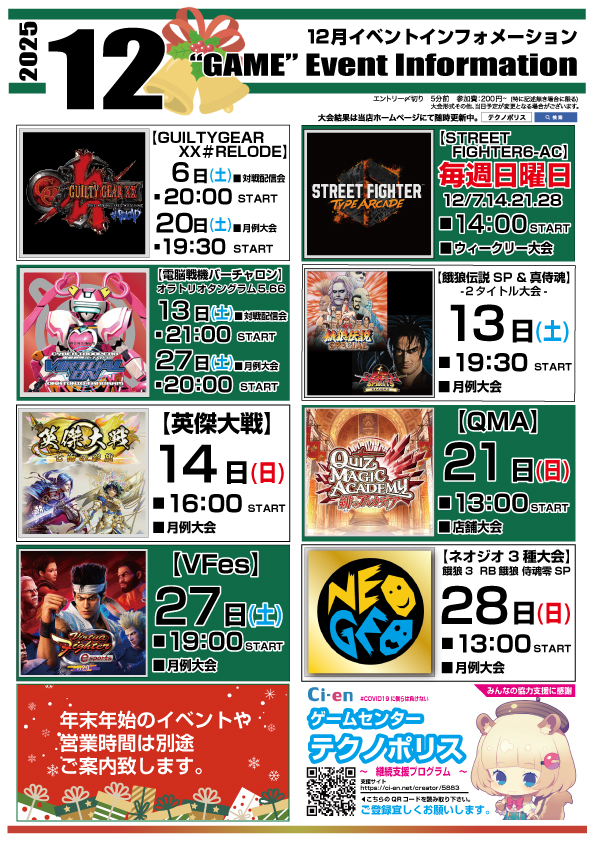| 28日 | 日 | 14:00~ | 『ネオジオ3種 月例大会』 『ストリートファイター6 TYPE ARCADE ウィークリー大会』 |