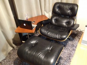 次は、私の唯一の自慢出来るリアル財産。イームズのラウンジチェアー(ハーマンミラー製 正規品)です。とある所で映像撮影用に使用されていたこの製品を中古ながらも、数年前に現在の住居に引っ越した際に譲って頂いて、現在も大切に使っている物です。新品では凄い高いイスで、中古でも値段が下がらない(正規品以外の他社製のリプロダクト製品は安いです。)イスです。