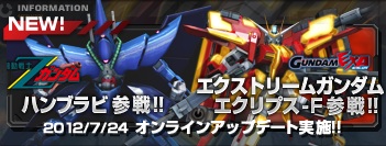 7/24(火)好評稼働中のガンダムEXVSフルブーストのアップデートが行われます。今回は新機体の2機体「エクストリームガンダム(type-レオス)エクリプス・フェース」、「ハンブラビ」追加とZガンダムでおなじみのニューホンコンシティがステージ追加されます。さらに、ゲームのバランス調整が大幅に行われ、過去最大のMSバランス調整が行われております。色々な変更点を自ら試して実践投入してみて下さいね。