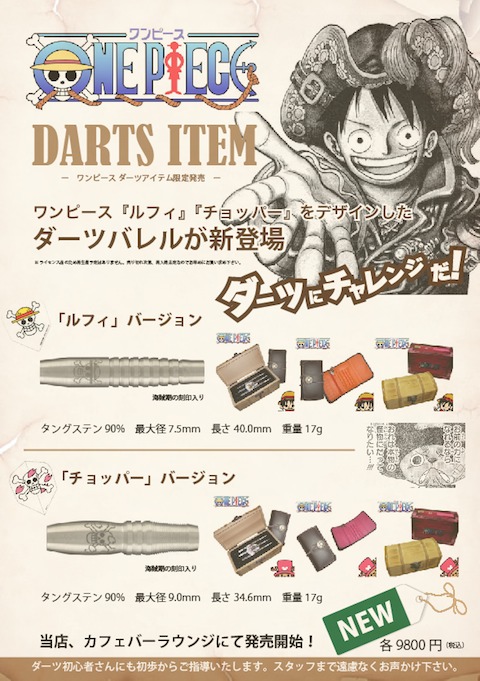 先ほどのけいおん!ダーツが入門者セットだったわけですが、このワンピースダーツは本格的なハイグレード仕様です。バレル(本体部分)の金属がタングステンという固く密度の濃い高級金属を90%含んだ物で、ダーツケースや木箱などもセットになっております。本当のオールインワンセットです!キャラクターダーツだからといって妥協無しの本格派!海の男にふさわしいです!(笑)