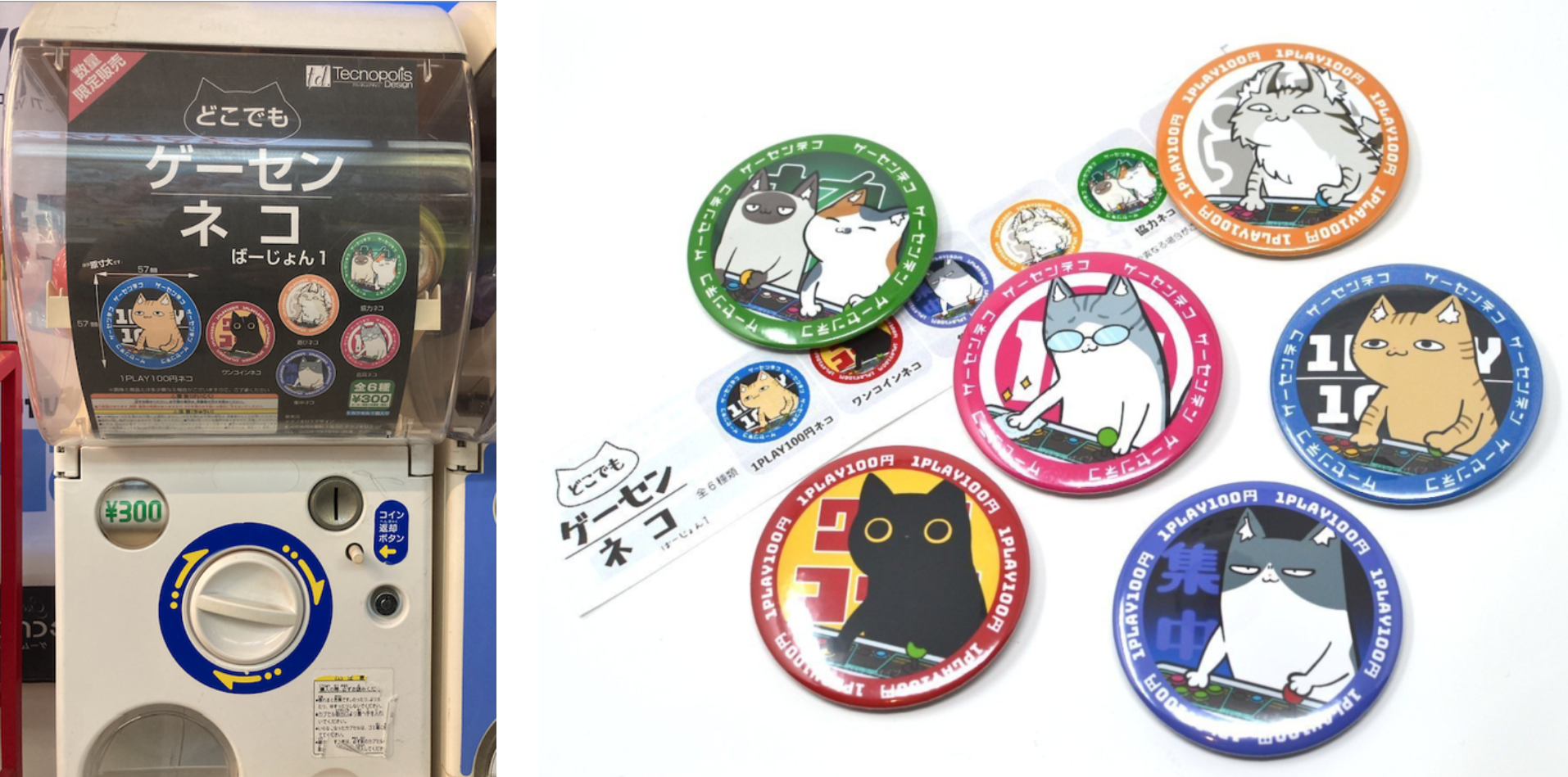 ゲーセンネコ缶バッチ(ばーじょん1)が今年の6月より、ゲームセンターテクノポリス様のガチャコーナーにて販売開始いたしました。